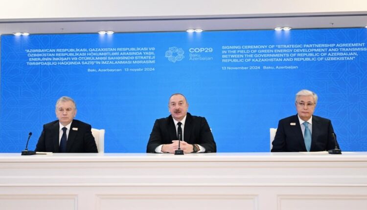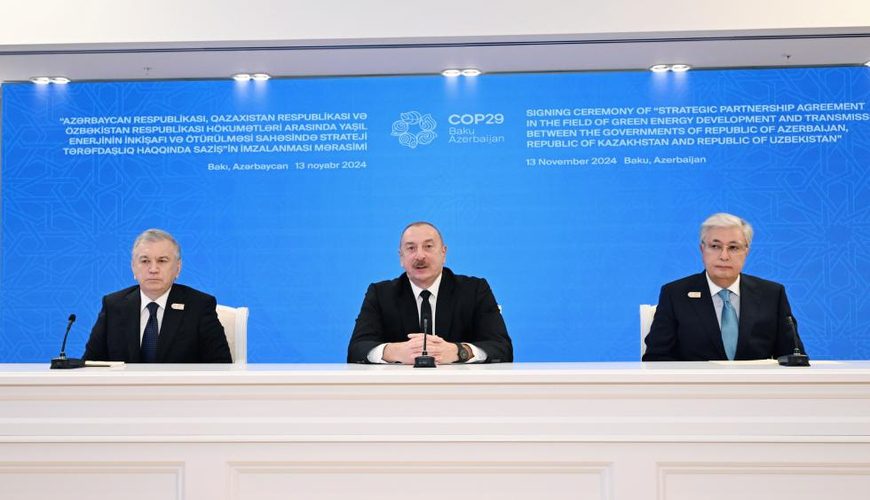 Zafer Tv xəbər verir ki, sonra Azərbaycanın, Qazaxıstanın və Özbəkistanın dövlət başçıları “Azərbaycan Respublikası, Qazaxıstan Respublikası və Özbəkistan Respublikası hökumətləri arasında yaşıl enerjinin inkişafı və ötürülməsi sahəsində strateji tərəfdaşlıq haqqında Saziş”i imzalayıblar.